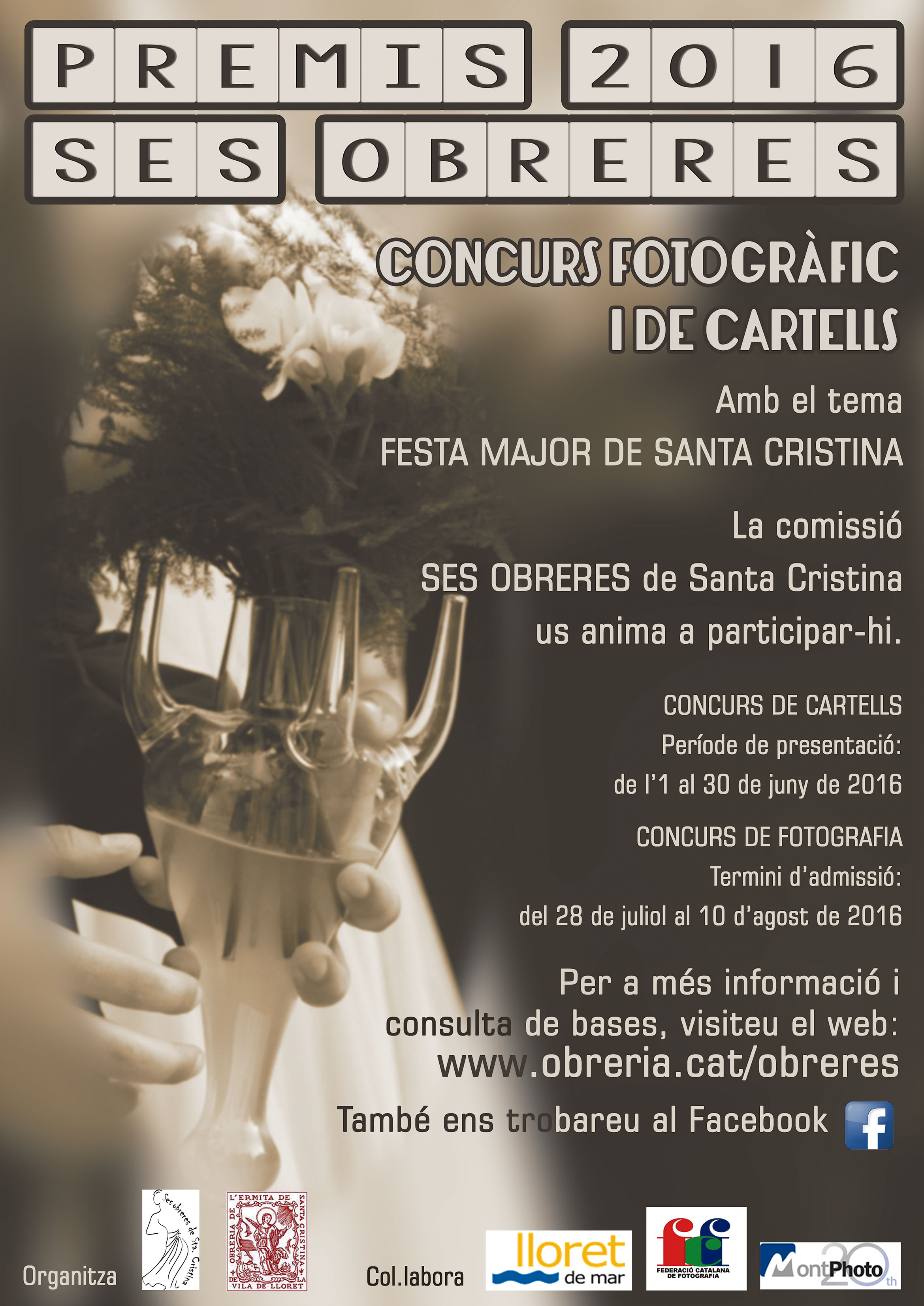 Un any més, l'associació d’exobreres de Santa Cristina de Lloret de Mar ha convocat el concurs de cartells i de fotografies de la Festa Major de Santa Cristina 2016. El termini de presentació pel concurs de cartells comença demà 1 de juny i s’allarga fins a finals de mes, fins el dia 30. Pel què fa al concurs de fotografies, el termini per a la presentació de les instantànies serà del 28 de juliol al 10 d’agost. El tema dels cartells que es presentin a concurs ha de ser sobre la Festa Major de Santa Cristina. El cartell guanyador servirà per il·lustrar els programes de l’any que ve. El procediment i les tècniques d'aquest concurs són lliures, sempre que permeti la reproducció i impressió posterior en color. El premi pel guanyador és de 300 € i el veredicte del jurat es donarà a conèixer l’11 de juliol a la sala d’actes de l’Obreria de Santa Cristina a les 20.00 h. I del 22 d’agost al 16 de setembre s’exposaran tots els cartells participants a la sala d’exposicions de la Casa de la Cultura. També hi ha un segon premi dotat en 200 € i un tercer amb 100€ i un premi especial Ses Obreres que consisteix en un trofeu commemoratiu de l’acte. El lliurament dels premis serà el dia 24 de juliol durant el sopar de l’Obreria de Santa Cristina, a la plaça del Pi.