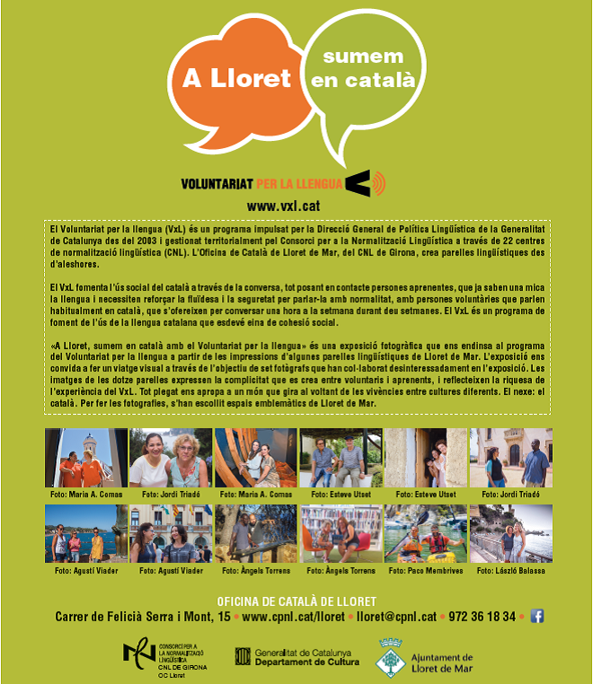 Dimarts que ve, dia 24 d’octubre, s’inaugura l’exposició "A Lloret, sumem en català amb el Voluntariat per la llengua". Es tracta d'una exposició fotogràfica que ens endinsa al programa del Voluntariat per la llengua a partir de les impressions d'algunes parelles lingüístiques de Lloret de Mar.