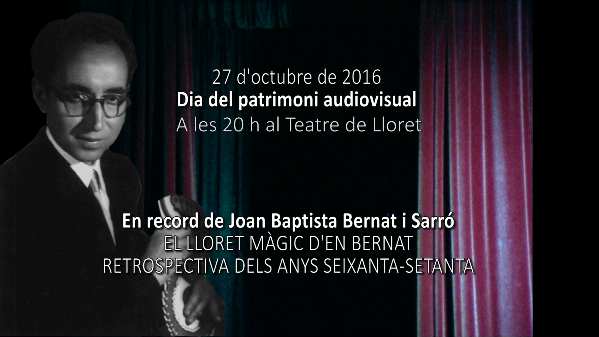 Es tracta de la projecció de l’audiovisual titulat: “En record de Joan Baptista Bernat i Sarró. El Lloret màgic d’en Bernat. Retrospectiva dels anys seixanta i setanta”. La projecció tindrà lloc el proper dijous, dia 27 d’octubre, a les 20h vespre, al Teatre de Lloret. L’acte comptarà amb l’assistència dels fills i les filles de Joan Baptista Bernat.
