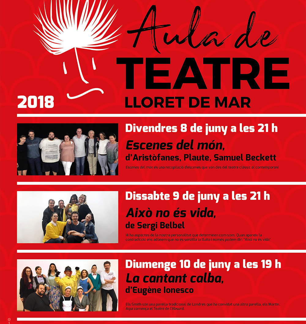 Aquest any s’han fet tres grups, inicial, segon i tercer, i cadascun actuarà un dia diferent, de divendres a diumenge. En aquest sentit s’ha programat “Escenes del món” d’Aristòfanes, Plaute i Samuel Beckett. Una obra que mostrarà una recopilació d’escenes que van des del teatre clàssic al contemporani. Aquesta funció s’ha programat pel divendres 8 de juny a les 21h i anirà a càrrec dels alumnes de cicle inicial.