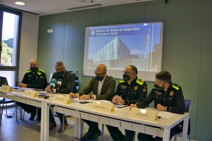 En l’àmbit de Seguretat Ciutadana, hi ha hagut un descens en les actes aixecades relatives a incidències derivades de conflictes en establiments públics, conflictes a la via pública, furts o robatoris, i han augmentat les actes aixecades per ocupacions en immobles o relacionades amb la violència masclista. El sergent Joan Ignasi Garcia ha explicat que “aquest 2021 ha estat marcat per moltes restriccions a causa de la covid i en concret pel toc de queda nocturn, i això es reflecteix en aquestes dades”. Pel que fa a les detencions, s’han incrementat en un 5% respecte a l’any 2019, malgrat haver-se reduït el nombre d’atestats penals en un 17%, dada que implica un augment en l’efectivitat de les actuacions policials dins de l’àmbit penal.