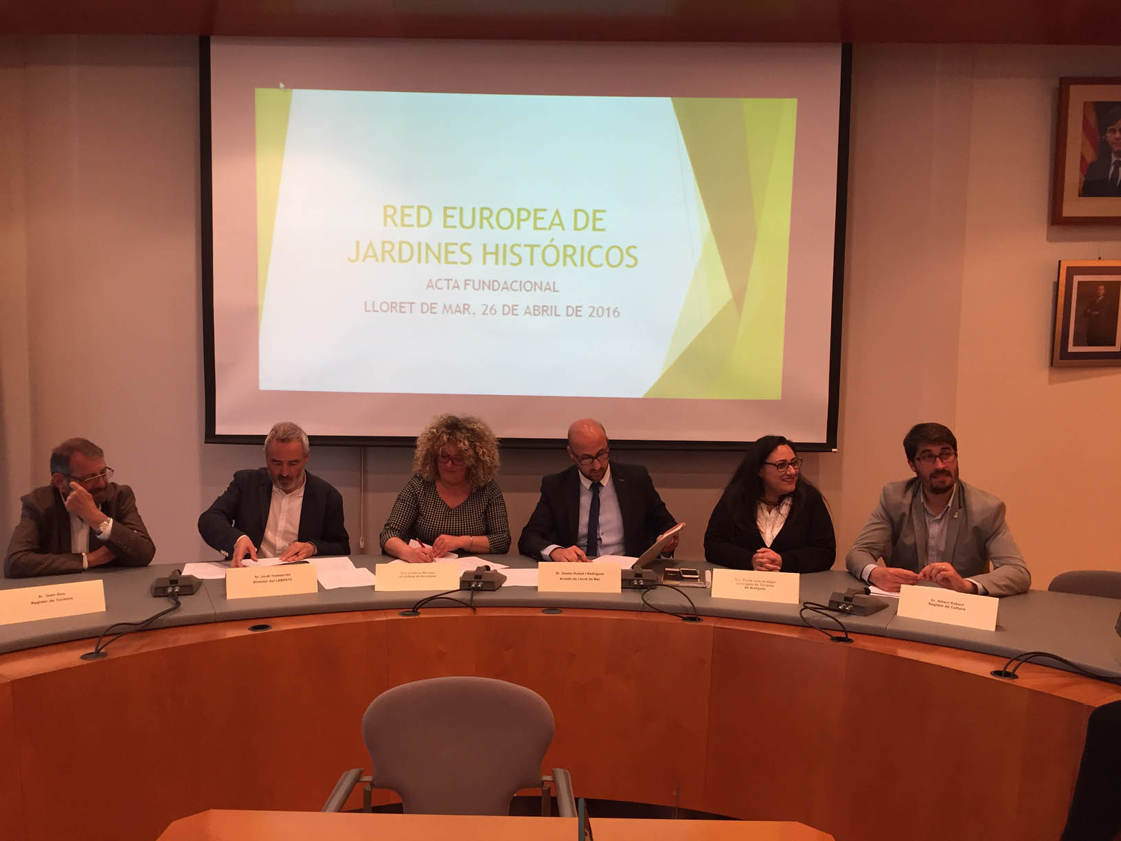 L’alcalde de Lloret de Mar, Sr. Jaume Dulsat; l’alcaldessa d’Aranjuez, Sra. Cristina Moreno, i el Dr. Jordi Tresserras, director del LABPATC, Laboratori de Patrimoni, Creativitat i Turisme Cultural a la Universitat de Barcelona acorden la creació de la seva Oficina Tècnica de Gestió, que tindrà la seva seu permanent a Lloret.