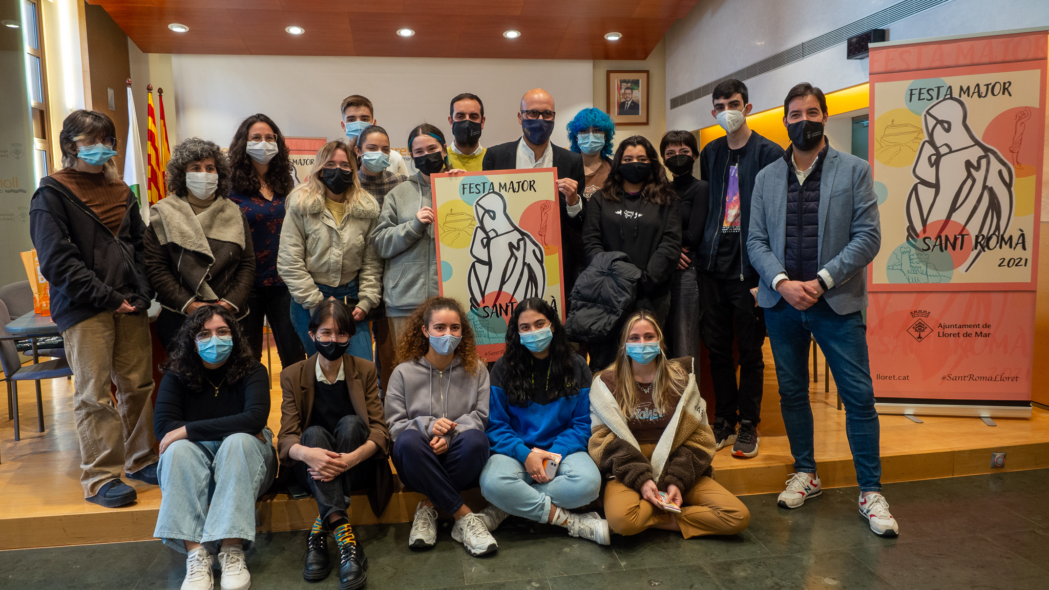 L’alcalde de Lloret de Mar, Jaume Dulsat, acompanyat del regidor de Festes, Cristian Fernández i el regidor d’Educació, Albert Ferràndez, han presentat avui la programació de la Festa Major de Sant Romà, patró de la vila. A l’acte hi ha assistit també l’autora del cartell, Marta Cadena, alumna de batxillerat artístic de l’institut Coll i Rodés, que ha vingut acompanyada dels seus companys de classe, la docent Rosa Oliveras i la directora del centre, Lluïsa Peralta.