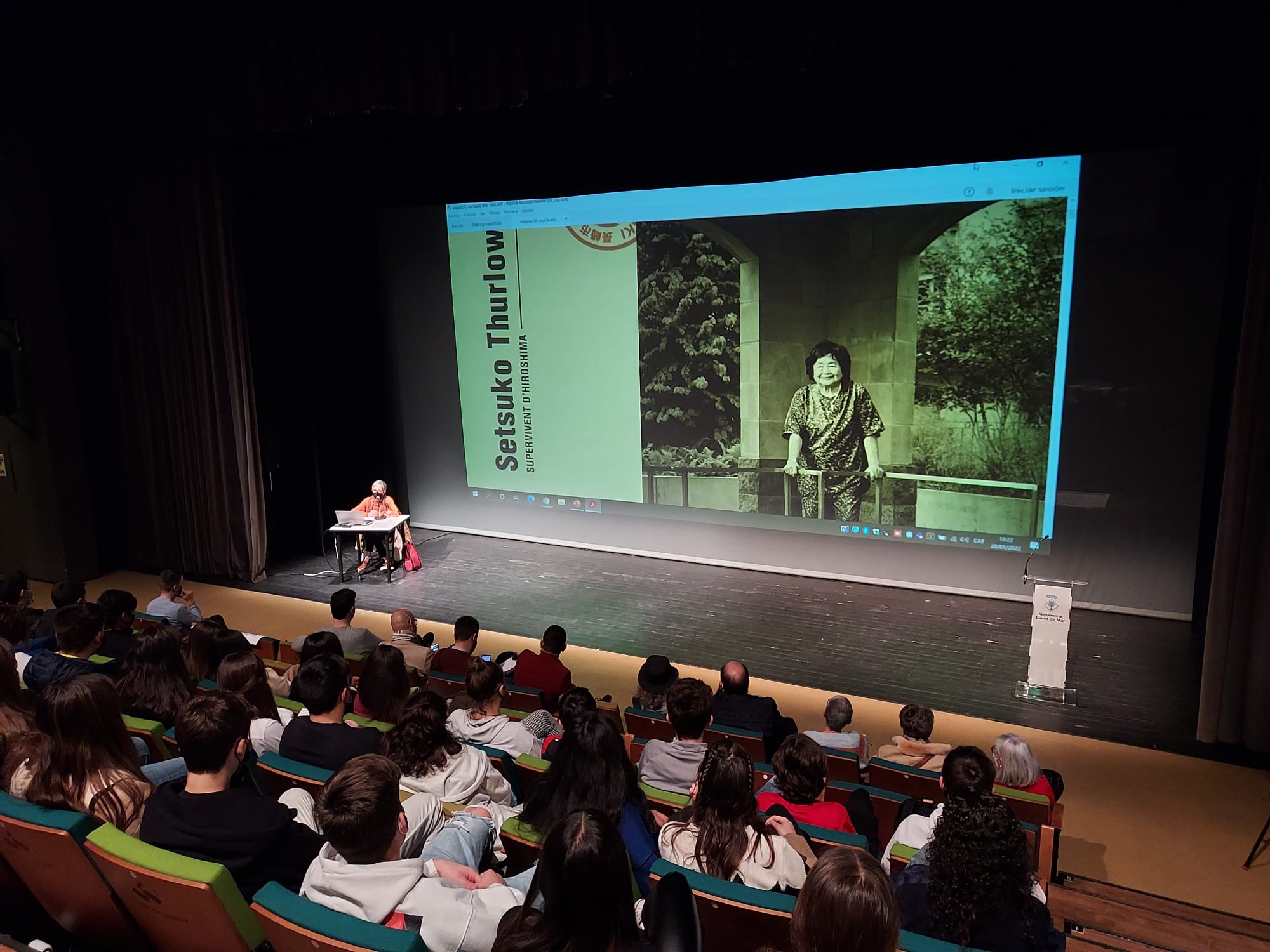 Més de 300 alumnes dels instituts de Lloret participen en una xerrada sobre les armes nuclears amb la presidenta de FundiPau al Teatre de Lloret