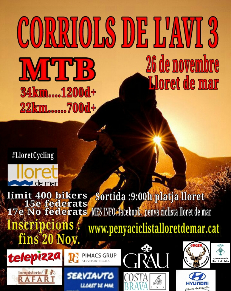 El proper diumenge 26 de novembre, a les 9 h, a sa Caleta, Lloret de Mar donarà el tret de sortida a la tercera edició dels Corriols de l’Avi, una cursa BTT que recorre els boscos de Lloret, passant per espais emblemàtics com l’Àngel, Sant Pere del Bosc o les Alegries, i que ofereix dues distàncies: 22 quilòmetres, amb un desnivell de 650, i 34 quilòmetres, amb un desnivell de 1.200. La Penya Ciclista de Lloret, organitzadors de la cursa, expliquen que es diu Corriols de l’Avi “Perquè són els corriols antics i els volem mantenir i preservar”.