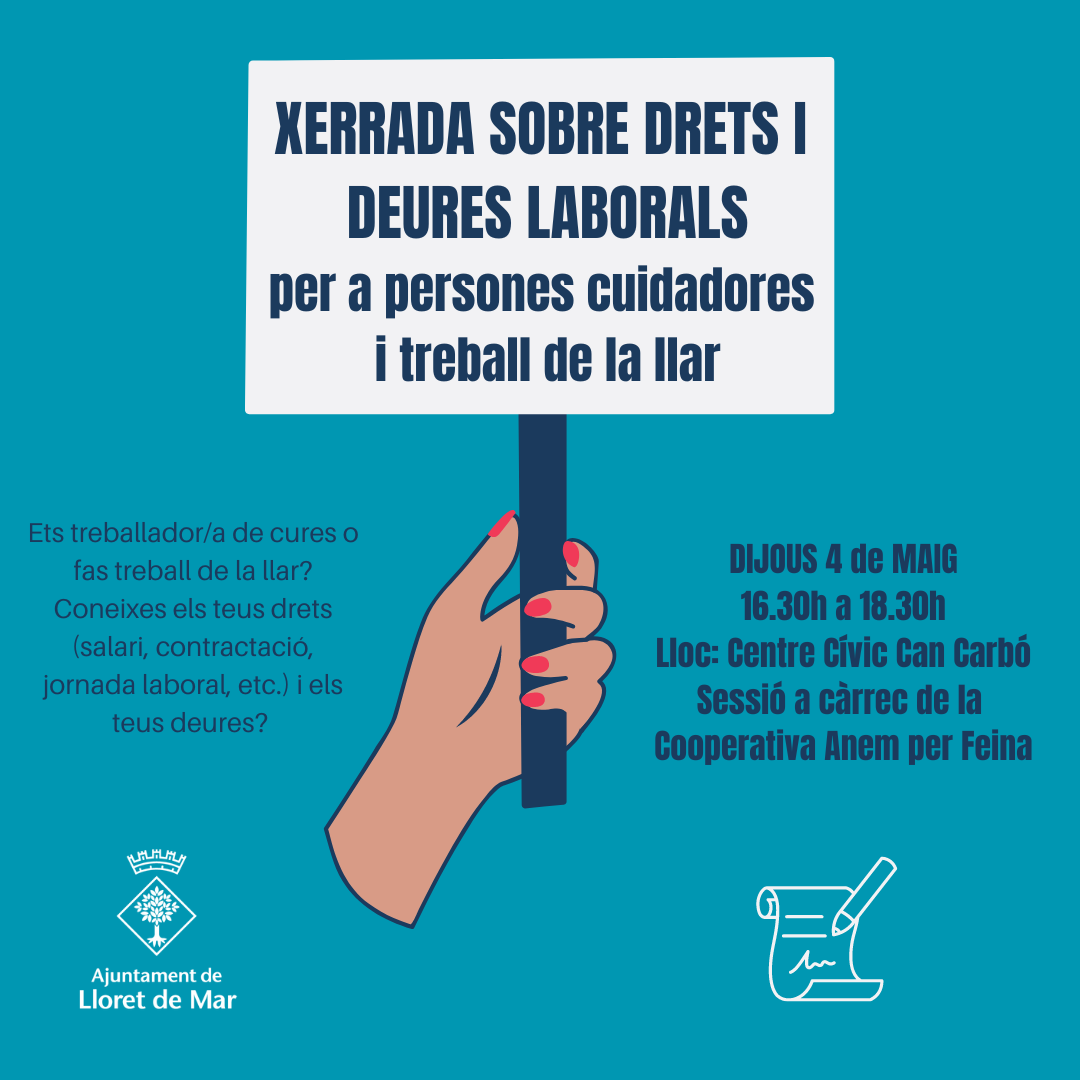 El proper dijous 4 de maig, de 16.30h a 18.30h al Centre Cívic de Can Carbó, l’Ajuntament de Lloret de Mar organitza una xerrada sobre els drets i deures laborals de les persones que treballen al sector de les cures i el treball de la llar. La xerrada es dura a terme amb la col·laboració de la Cooperativa Anem per Feina, especialistes en la intermediació en treball de cures i de la llar. En paraules de la regidora de Benestar i Família, Arantxa Jimenez, “L’objectiu de la xerrada, a més de poder disposar de la informació legal actualitzada, és seguir afavorint l’apoderament de les persones treballadores per tal de poder seguir exercint els seus drets i deures laborals i personals”.