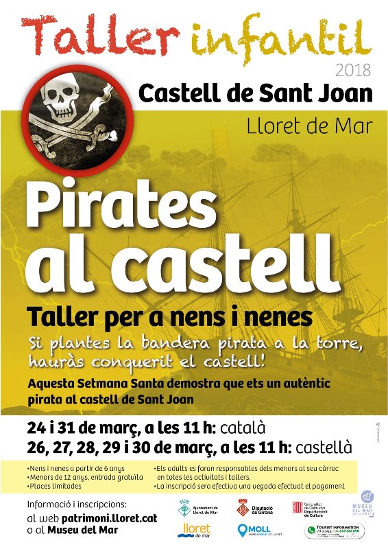 Taller infantil per a nens i nenes a partir de 6 anys, al Castell de Sant Joan els dies 24 i 31 de març en català i els dies 26,27,28,29 i 30 en castellà a les 11 h, Els nens hauran de superar diferents obstacles i proves per aconseguir arribar a la bandera pirata,Places limitades, venda d'entrades anticipades al Museu del Mar o al Web: patrimoni.lloret.cat