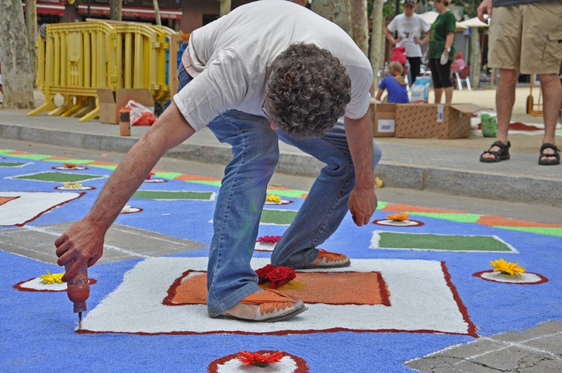 Confecció de catifes de Corpus. Acte organitzat per la Parròquia de Lloret amb la col·laboració del Consell Parroquial, Geganters de Lloret, Veïnat Alegries, Casal de l'Obrera, Obreria de Santa Cristina i Confraria de Sant Elm.