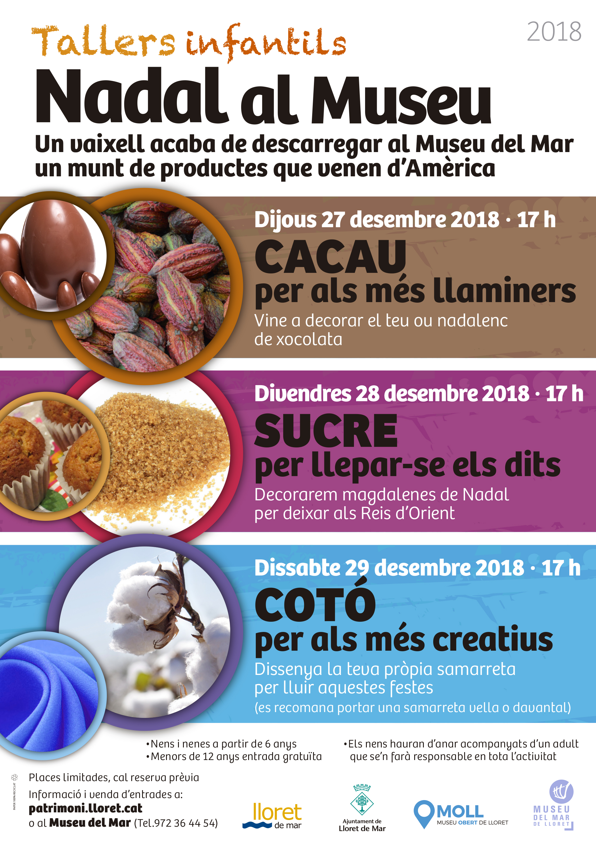 Tallers infantils, els dies 27,28 i 29 de desembre,cada dia un taller diferent!! places limitades, venda d'entrades al Museu del Mar tel.972364454 o a patrimoni.lloret.cat
