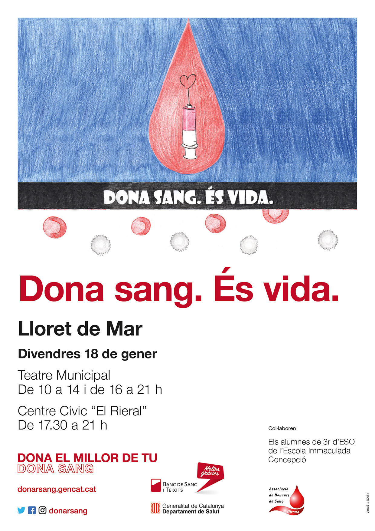 Donació de sang, al Centre Cívic del Rieral i al Teatre de Lloret. Col·laboren els alumnes de 3r d'ESO de l'Escola Immaculada Concepció.