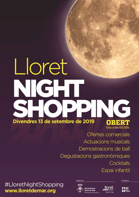 Aquest divendres 13 de setembre l’Ajuntament de Lloret de Mar, amb la col·laboració de l’Associació de comerciants, organitza una nova edició de la Lloret Night Shopping. Fins a les 00.30h podreu gaudir de descomptes comercials, l’espai infantil, actuacions musicals en viu, DJ’s, demostracions de ball, photocalls, còctels, gastronomia... En total una cinquantena d’activitats que fan d’aquest esdeveniment l’autèntica festa del comerç lloretenc. Us hi esperem!!!