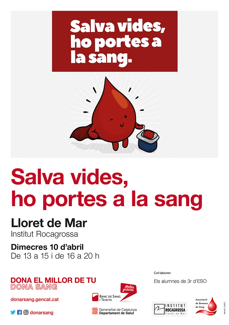 Jornada de donació de sang a l'Institut Rocagrossa. De 13 a 15 h i de 16 a 20 h.