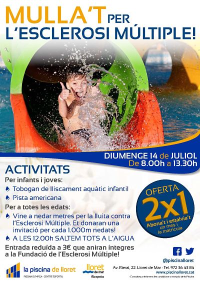 Activitat solidaria amb la lluita contra l'Esclerosi Múltiple. Vine a la Piscina Municipal a nedar metres solidaris a partir de les 8.00 hores i fins les 13.30 h, i fes el salt a l'aigua amb la resta del país a les 12.00 h. Hi haurà a més, pistes americanes pels infants i joves!