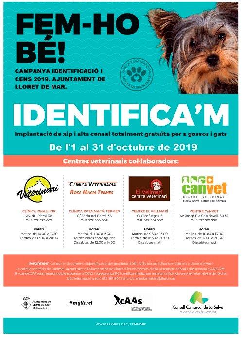 Campanya d'identificació i cens gratuït de l'any en curs de gossos, gats i fures adreçada a la ciutadania de Lloret. Amb la participació de les clíniques veterinàries.