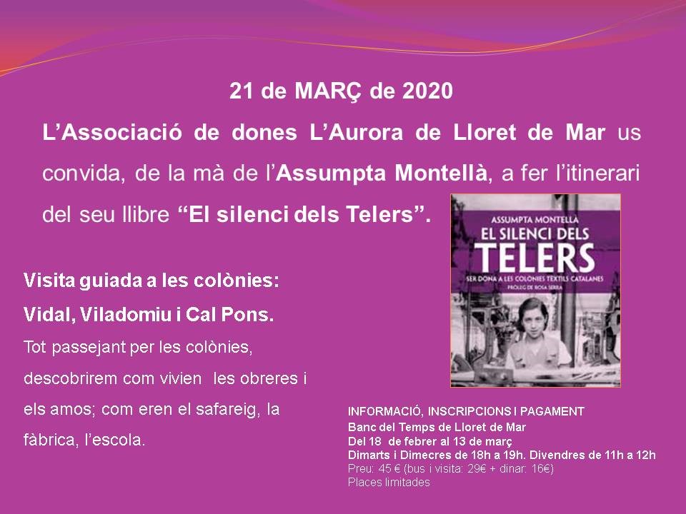 Visita guiada a les colònies tèxtils: Vidal, Viladomiu i Cal Pons. Tot passejant per les colònies de la mà d'Assumpte Montellà (autora i escriptora del llibre 'El Silenci dels Telers'). Descubrirem com vivien les obreres i els amos, el safareig, la fàbrica, l'escola... Preu 45 euros, amb dinar inclòs.Les places son molt limitades.
