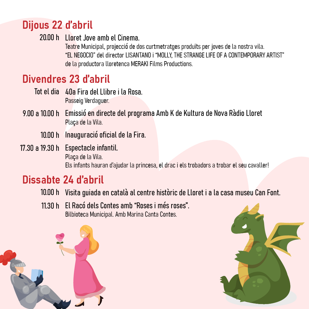 Fira de Sant Jordi. De les 09:00 a 10:00 emissió en directe del programa Amb K de Kultura de Nova Ràdio Lloret. A les 10:00 inauguració oficial de la Fira. De les 17:30 a les 19:30 Espectacle infantil a la plaça de la Vila.