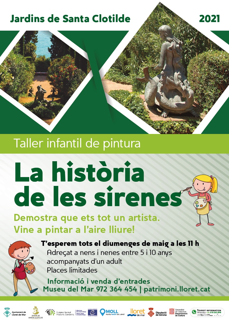 Tots els diumenges de maig farem un taller de pintura als Jardins de Santa Clotilde, a la plaça de les sirenes explicarem la mitologia de les sirenes en forma de conte i a continuació els nens i nenes de manera individual pintaran un dibuix amb el suport de la pintora Eva Ramos. Adreçat a nens i nenes entre 5 i 10 anys. Places limitades. Venda anticipada d'entrades al Museu del Mar, tel. 972364454 i al web