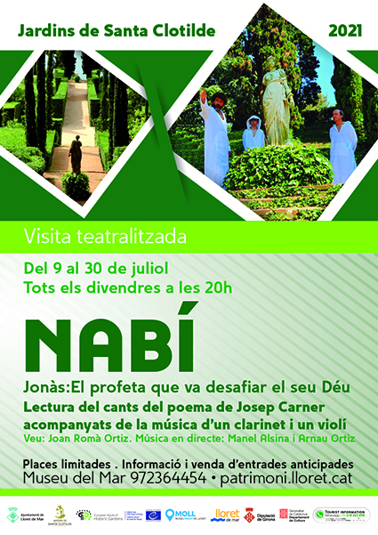 Nabí és una de les obres cabdals de Josep Carner, el Príncep de les lletres catalanes. En aquest poema ens explica la història bíblica del Profeta Jonàs. Llegirem els cants d'aquest poema als jardins acompanyats de la música d'un violí i un clarinet. Places limitades. Venda anticipada d'entrades al Museu del Mar 972364454 o al web