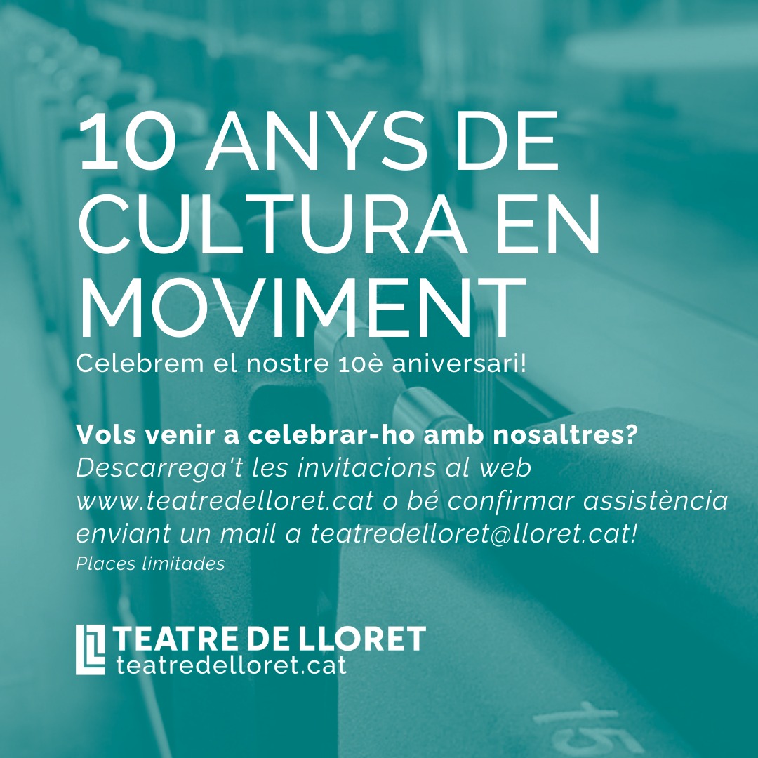 Des del novembre de l’any 2011 fins avui, han estat 10 anys intensos d’aprenentatge, de vivències, d’encerts i errors, de compartir emocions i de fer arribar la cultura arreu del municipi i al nostre entorn. D’implicar a tothom, de fer sentir el Teatre de Lloret un espai per a tothom. I esperem, amb el vostre suport i la vostra complicitat, seguir-vos emocionant i acompanyant 10 anys més, + 10 + 10...
