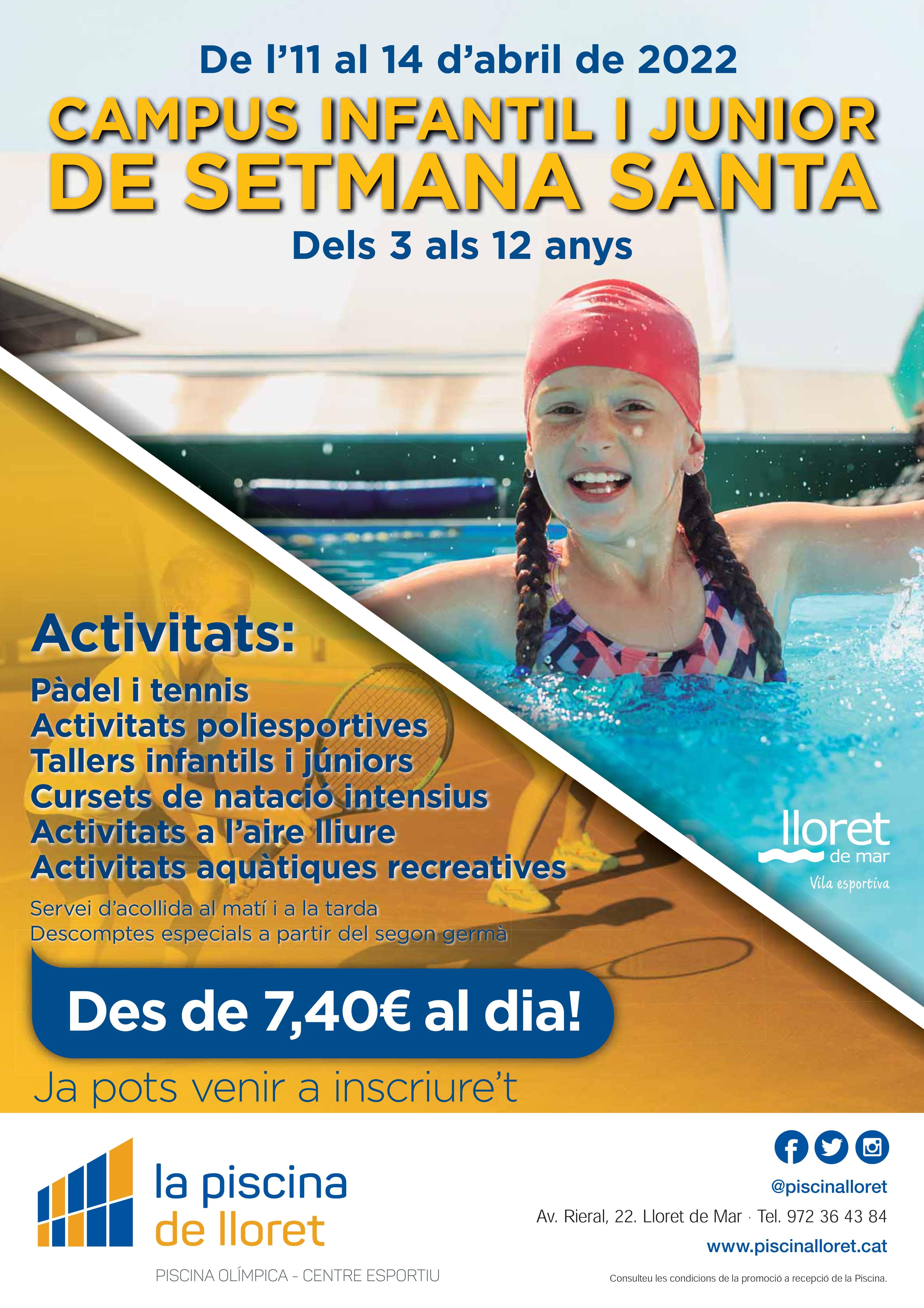 Campus multiesportiu de Setmana Santa amb activitats com el pàdel, tennis, natació i activitats aquàtiques recreatives, jocs populars i tradicionals i activitats esportives com el bàsquet, futbol sala, handbol...amb decomptes a partir del segon germà i servei d'acollida de 8 a 9h i de 13 a 14h.