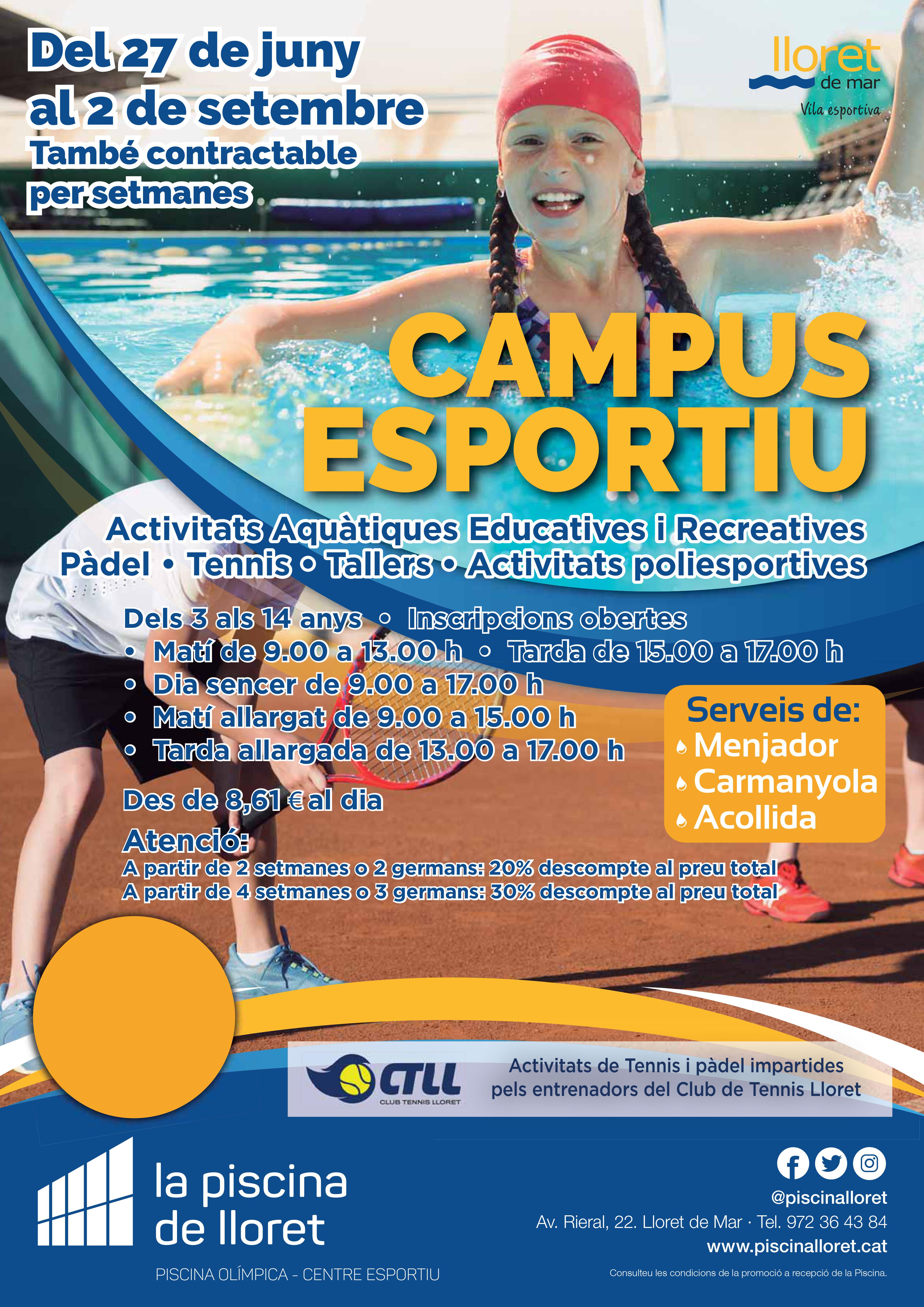 Campus esportiu i recreatiu per infants de 3 als 14 anys, amb activitats aquàtiques educatives i recreatives, pàdel i tennis impartit per entrenadors del CT Lloret, activitats poliesportives, tallers... contractable per setmanes, amb descomptes especials per nombre de setmanes i germans. Diverses opcions (matí, matí + tarda, tot el dia... amb servei de menjador o carmanyola i servei d'acollida de 8 a 9 h, de 13 a 14 h i de 17 a 18 h.)
