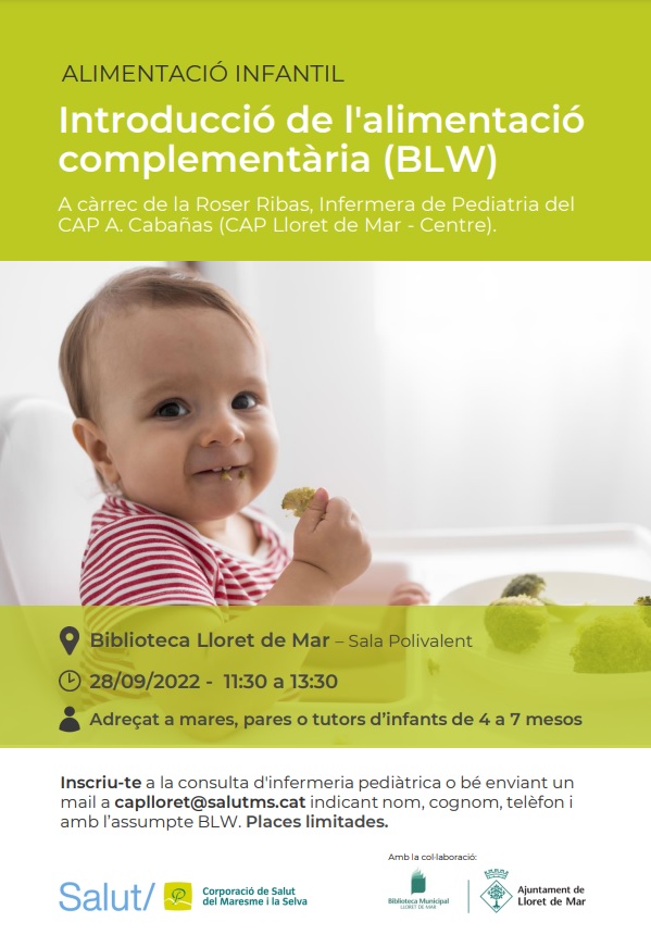 Inscriu-te a la consulta d'infermeria pediàtrica o bé enviant un mail a caplloret@salutms.cat indicant nom, cognom, telèfon i amb l’assumpte BLW.