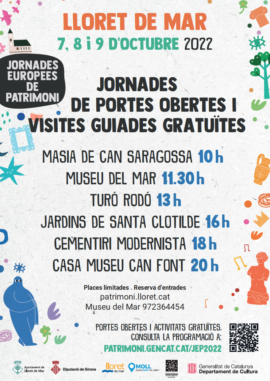 Jornades de portes obertes a la Masia de Can Saragossa, Museu del Mar, Poblat iber de Turó Rodó, Jardins de Santa Clotilde i Castell de Sant Joan, en els horaris habituals. Visites guiades gratuïtes en els espais i horaris senyalats. Places limitades amb reserva prèvia a patrimoni.lloret.cat o al Museu del Mar 972364454