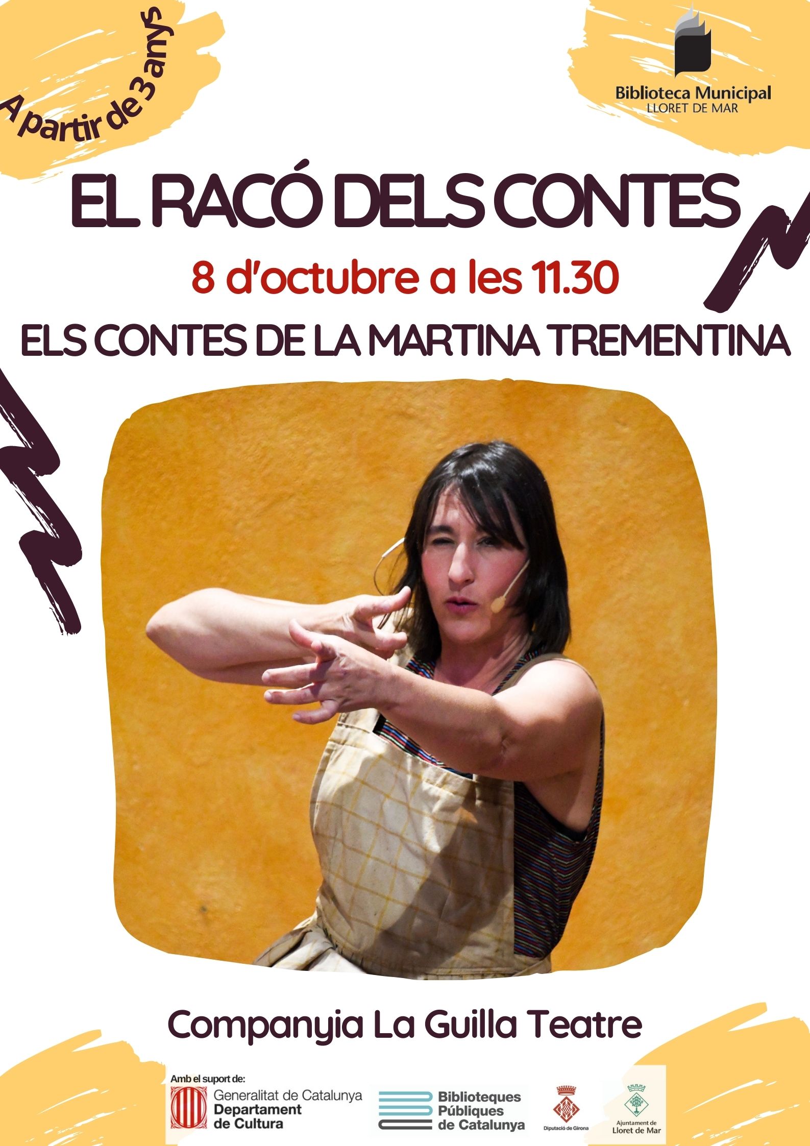 La Martina Trementina és neta d'una remeiera, l’àvia Remei recollia herbes medicinals, plantes aromàtiques, resines dels arbres, i en feia ungüents i olis essencials com la Trementina. Anava a vendre els seus productes naturals fent llargs viatges a peu fins a arribar a pobles i ciutats. En aquella època no hi havia telèfons mòbils ni internet i la gent s'explicava històries. L'àvia Remei recollia contes, històries i faules i les utilitzava com les herbes medicinals, perquè els contes poden curar de l'avorriment, ajuden a mantenir el cor esponjat, el cap ben clar i sobretot a mantenir els somnis ben vius! Amb les seves històries la Martina us explicarà qui eren aquestes dones que anaven pel món: Les Trementinaires. Dia i hora: 8 d'octubre, a les 11.30 h Lloc: Sala Infantil Edat: a partir de 3 anys Idioma: català A càrrec de: Companyia La Guilla teatre