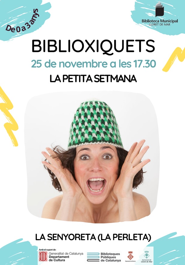 Biblioxiquets: 'La petita setmana', a càrrec de la Senyoreta (La perleta) 17:30 h Sala Infantil Edat: 0 a 3 ansys La Senyoreta juga amb els dies de la setmana. És un espectacle visual que vol captivar els més petits a través dels sons, els objectes i petites històries de cada dia.
