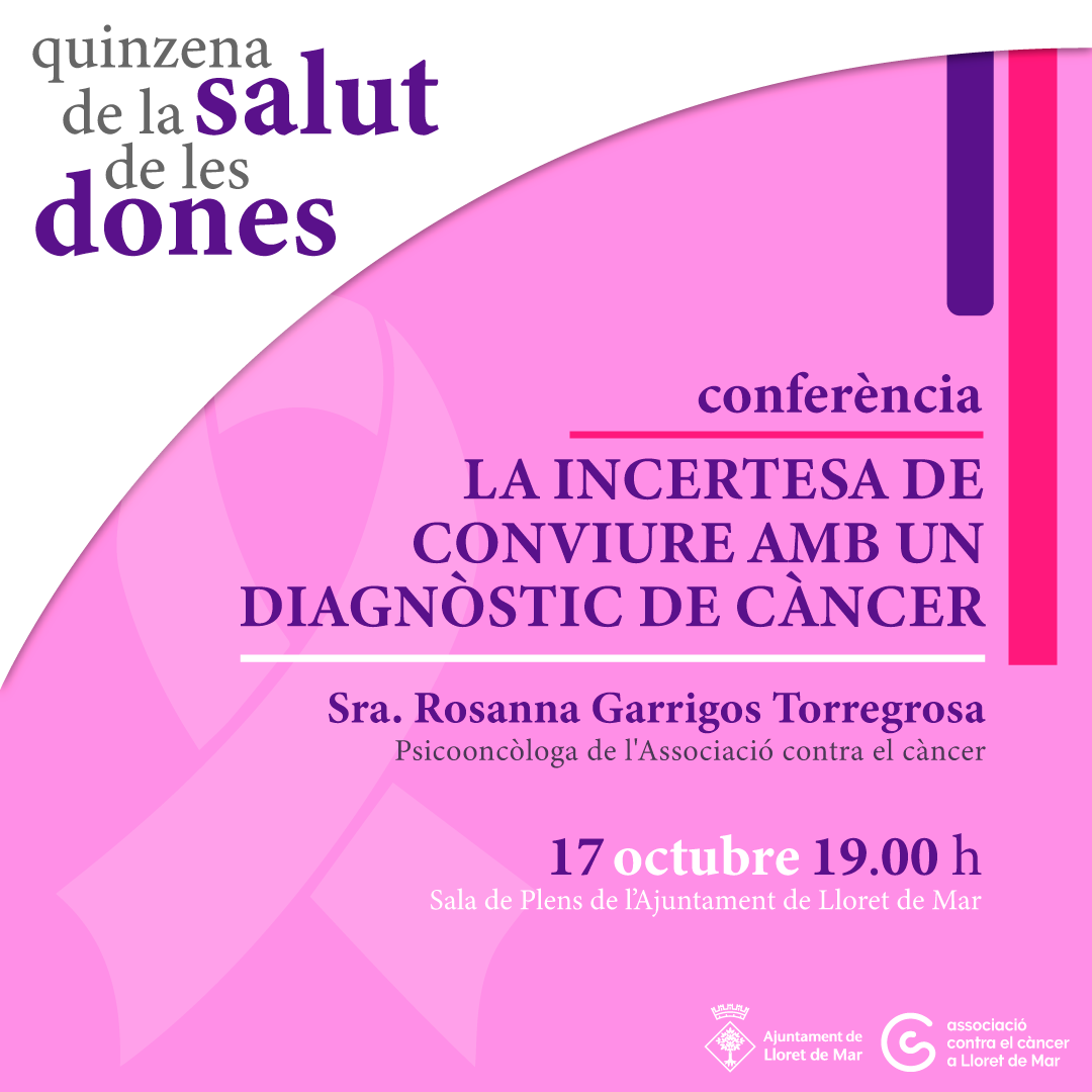 Quinzena de la Salut de les dones: en motiu de la celebració el 19 d'octubre del Dia Internacional de la lluita contra el càncer de mama, la Regidoria d'Igualtat ha organitzat la conferència: La incertesa de conviure amb un càncer de mama, el dia 17 d'octubre, a càrrec de la Sra. Rosanna Garrigos Torregrosa - Psicooncòloga de l'Associació contra el càncer- i amb el suport de l'Associació contra el càncer de Lloret de Mar.