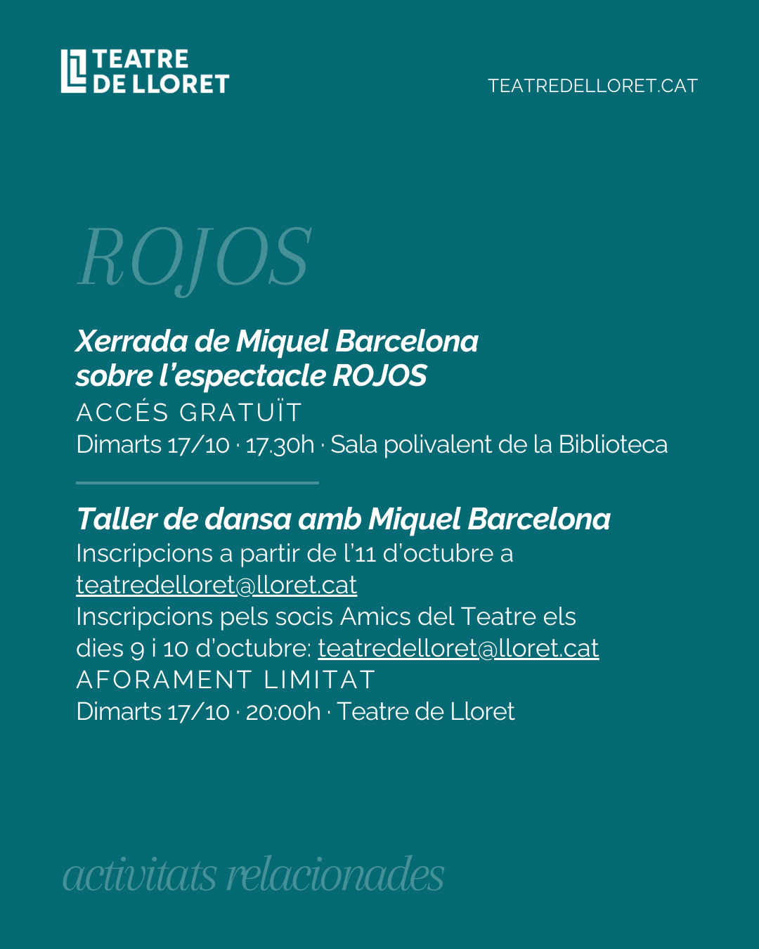 I a les 20 h Taller de dansa amb Miquel Barcelona al Teatre de Lloret (inscripcions a partir de l'11 d'octubre a teatredelloret@lloret.cat. Inscripcions pels socis Amics del Teatre els dies 9 i 10 d'octubre: teatredelloret@lloret.cat). Aforament limitat.