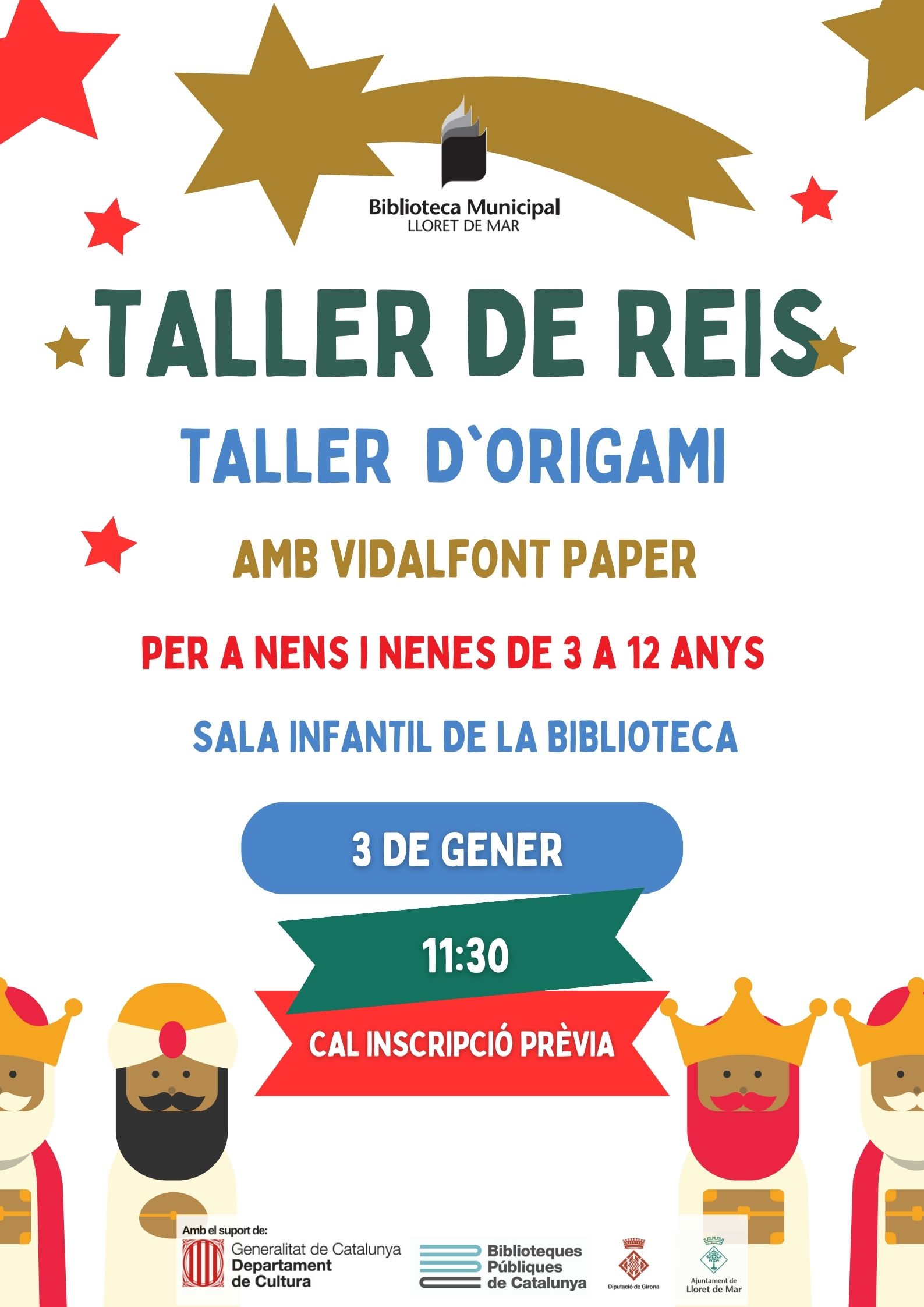 Taller familiar d'origami, per a la creació dels Tres Reis Mags de l’Orient. Taller imaginatiu on cada participant elaborarà els reis de forma senzilla però treballant la memòria, la motricitat fina i la creativitat. Edat: de 3 a 12 anys (els menors de 8 anys han de venir acompanyats) Cal inscripció prèvia