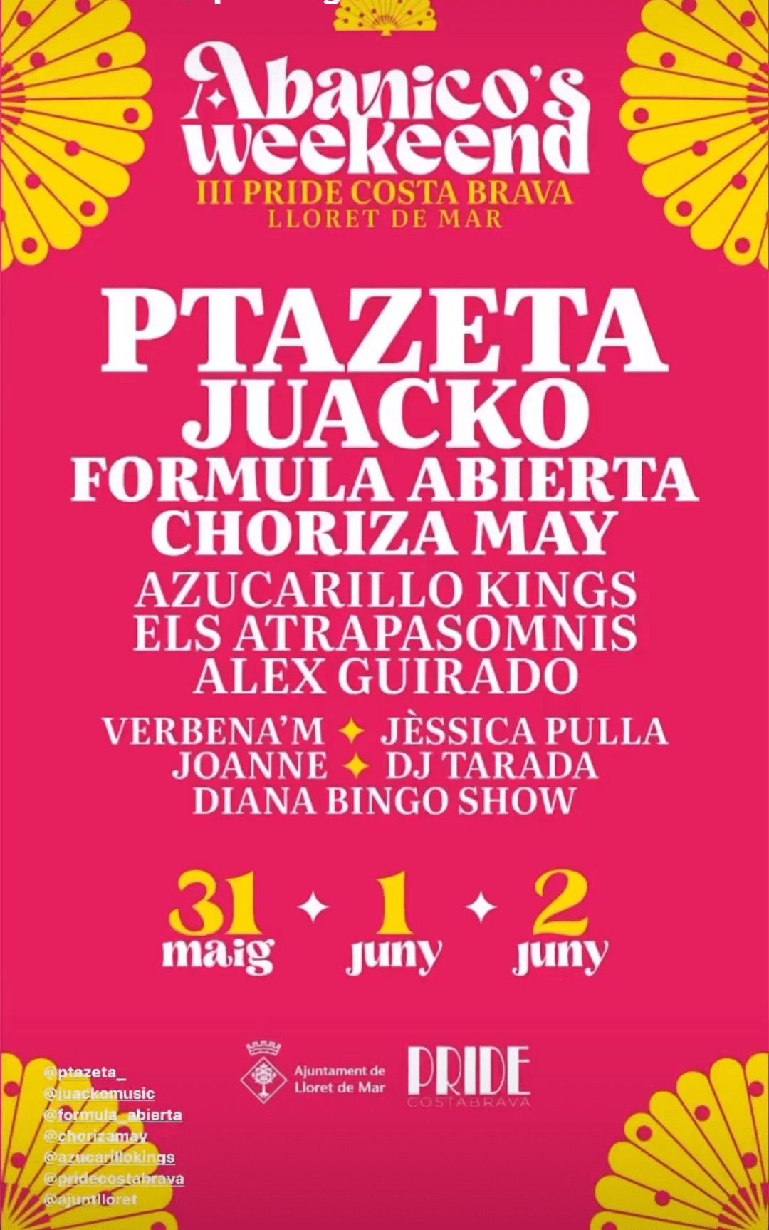 Festival PRIDE: pregó, actuació de Diana Bingo Show i Alex Guirado, actuació del grup musical Azucarillo Kings. Post Party a la dicoteca Gotham a les 00.30 h: Verbenam.