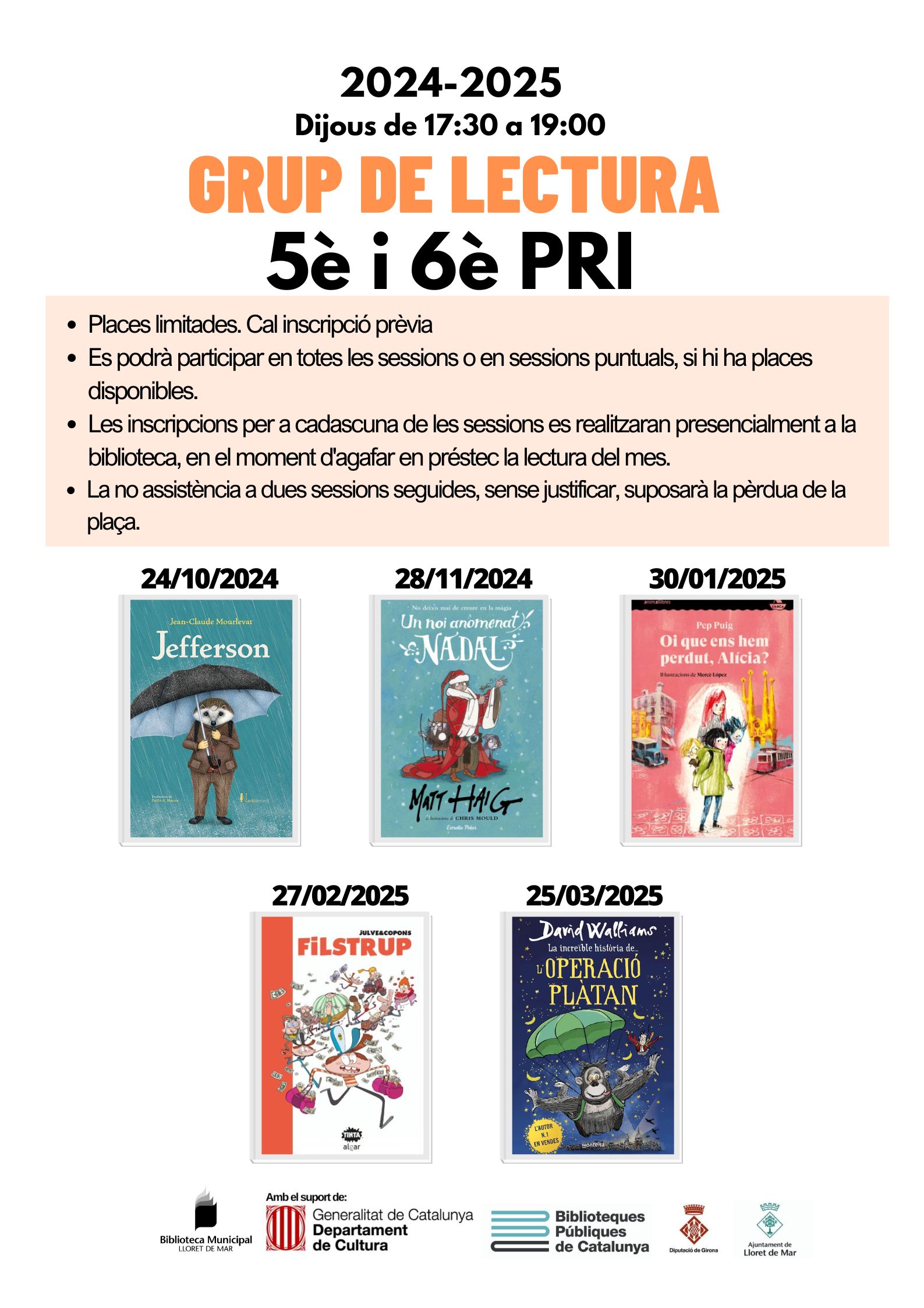 Les inscripcions per a cadascuna de les sessions es realitzaran presencialment a la biblioteca, en el moment d'agafar en préstec la lectura del mes.