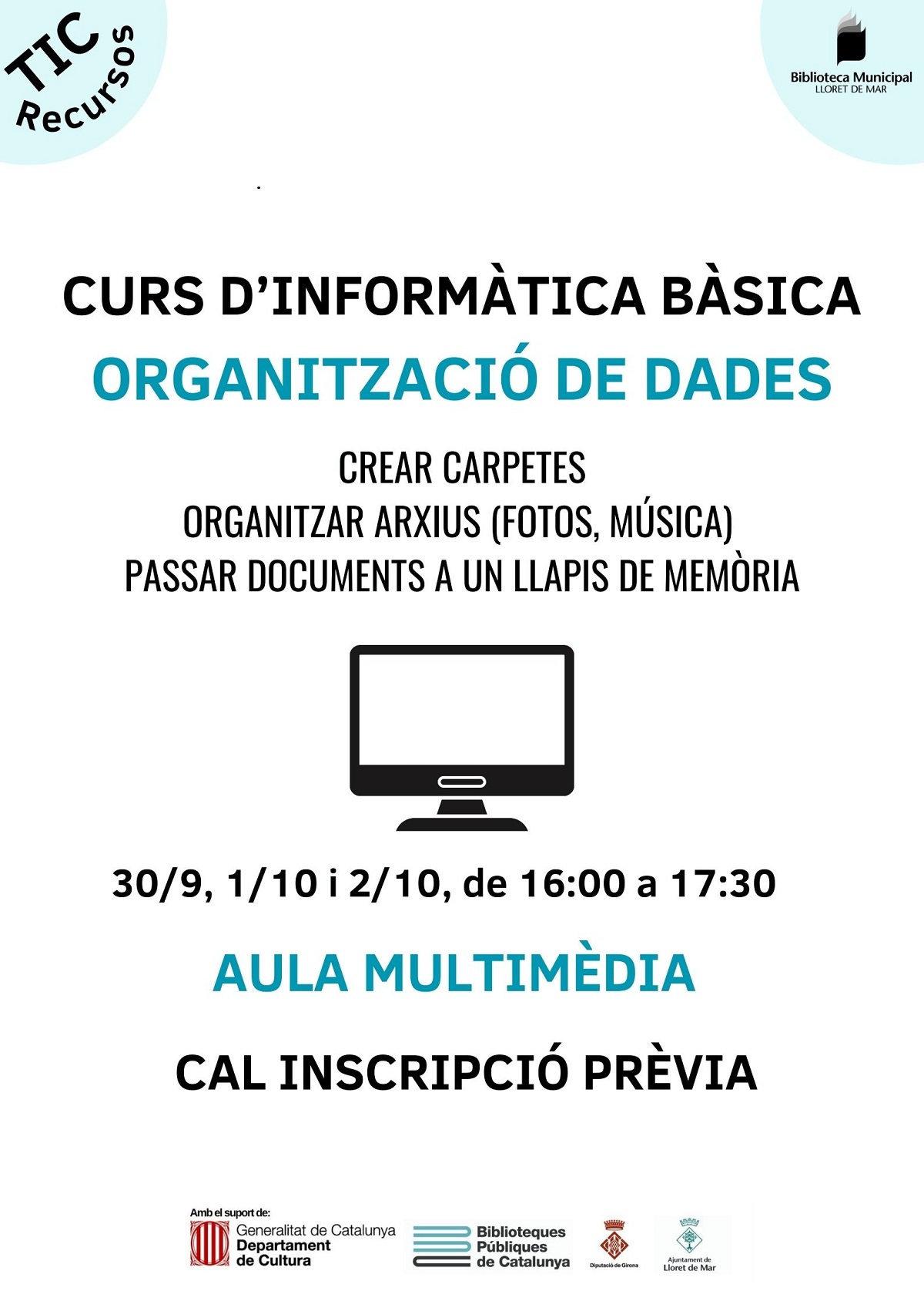 Curs d'Informàtica Bàsica. Organització de dades. A càrrec d'Elena Sarmiento -Crear carpetes -Organitzar arxius (fotos, musica) -Passar documents a un llapis de memòria 30/9, 1/10 i 2/10 de 16:00 a 17:30 Places Limitades Cal inscripció prèvia