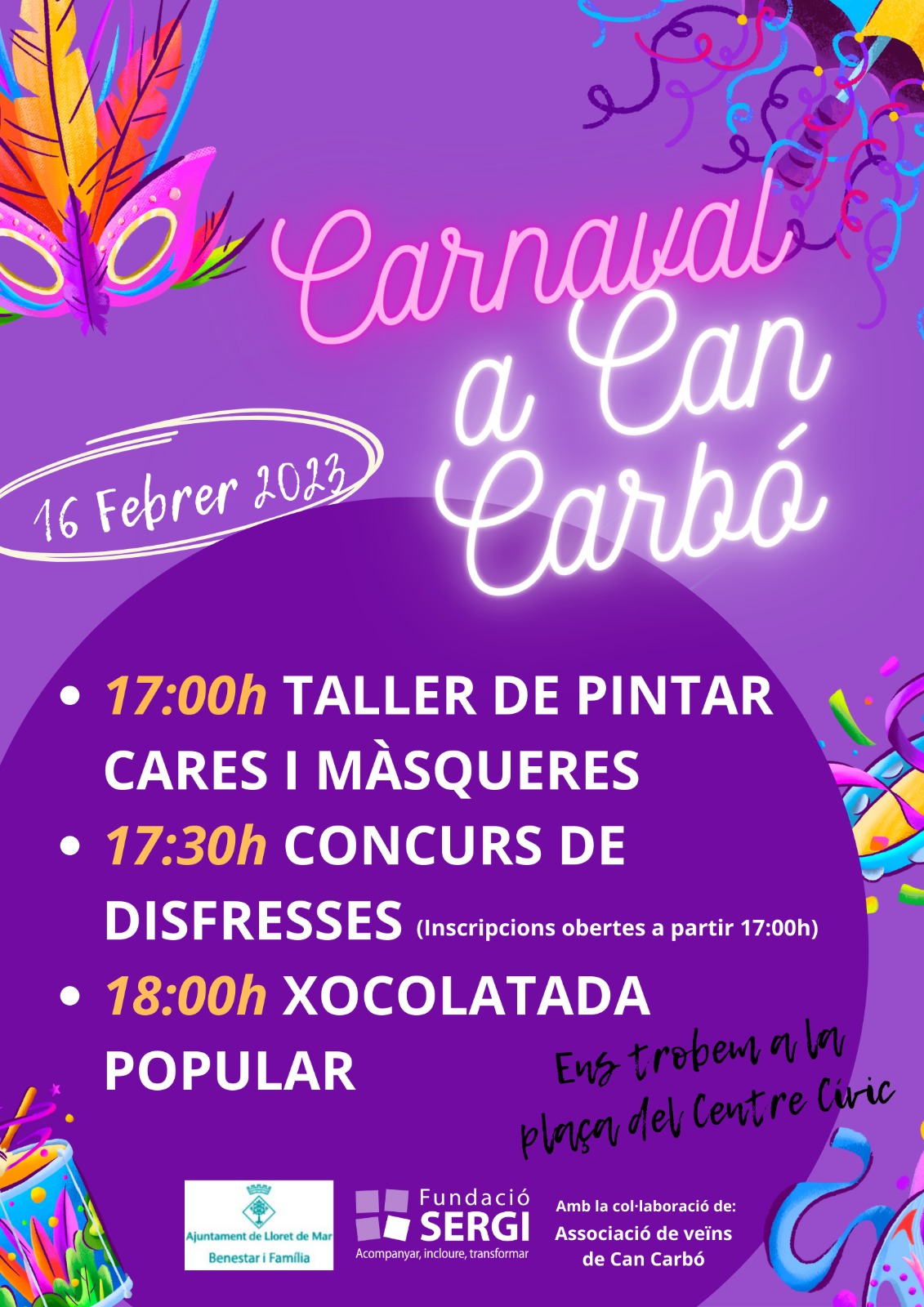 Carnaval de Can Carbó amb taller de pinta cares i màscares, concurs de disfresses i xocolatada popular.