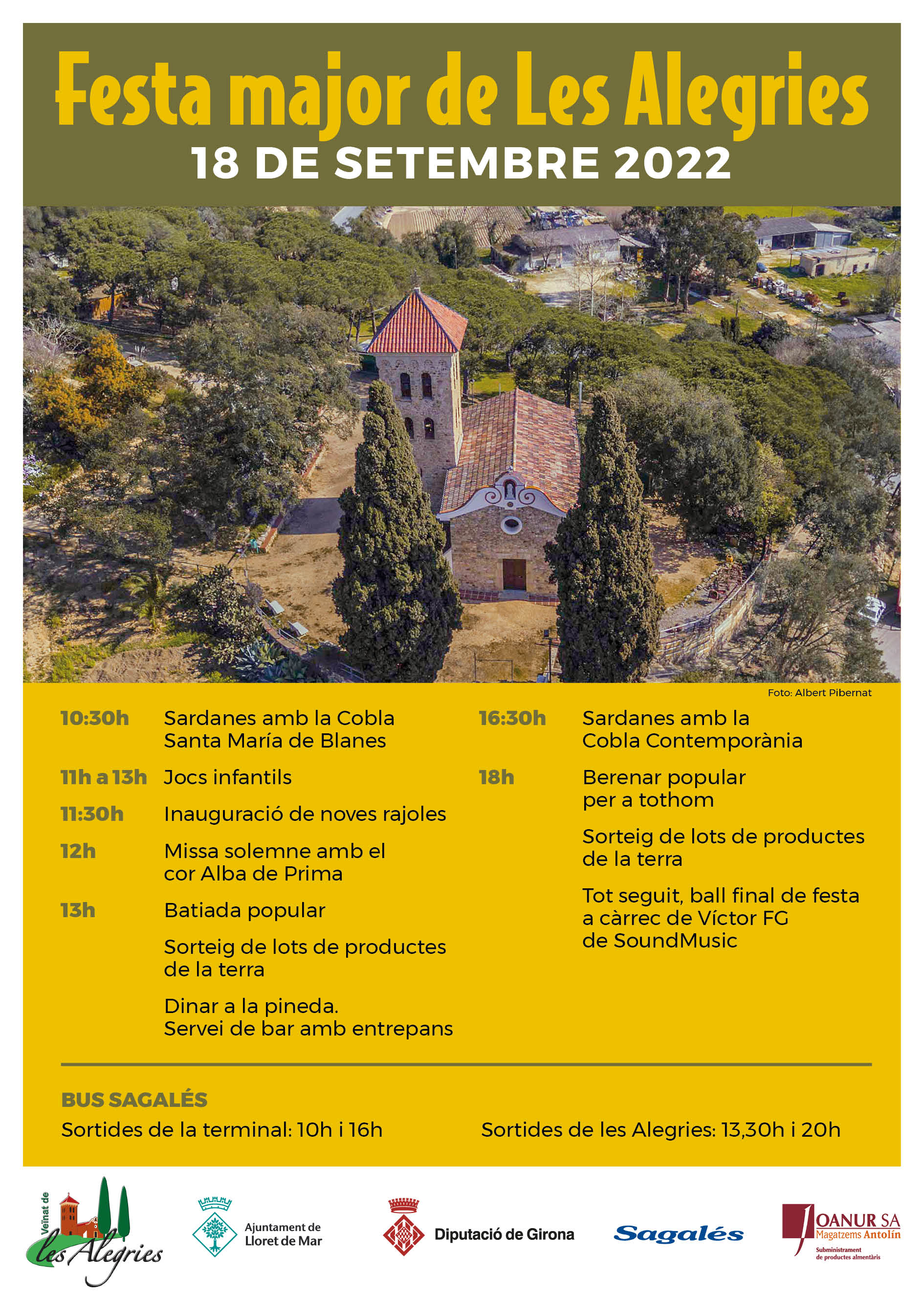Festa Major de les Alegries amb sardanes, jocs infantils, missa solemne, berenar popular i moltes activitats més.