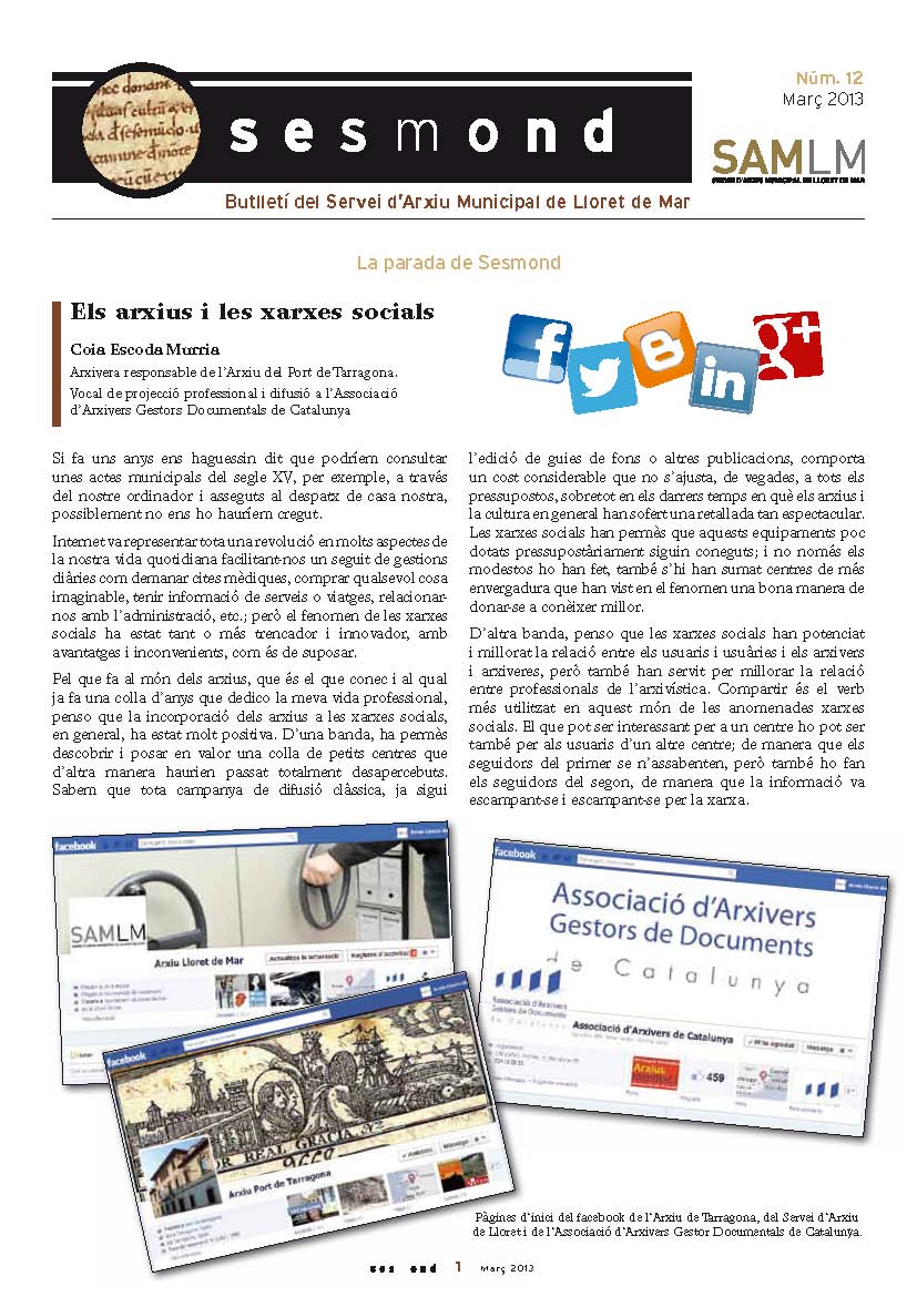 Ens plau convidar-vos a la presentació del núm. 12 del butlletí del Servei d'Arxiu Muncipal: SESMOND, que es realitzarà el proper dijous, dia 21 de març, a les 8 del vespre a la sala d'actes de l'Ajuntament.