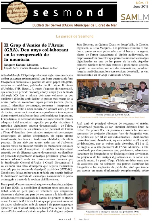 El proper dimecres, dia 28 de març, a les 8 del vespre a la sala d'actes de l'Ajuntament es presentarà el nou número del butlletí Sesmond. Enguany serà l'onzena edició d'aquest butlletí. A través de l'edició d'aquest butlletí es pretén, d'una banda, informar sobre les tasques i activitats que es fan des del Servei d'Arxiu Municipal per tal de conservar, protegir i difondre el nostre patrimoni documental; i de l'altra, donar a conèixer els treballs de recerca i d'investigació que s'hagin realitzat a partir de la consulta de diferents fons documentals vinculats a la nostra població.