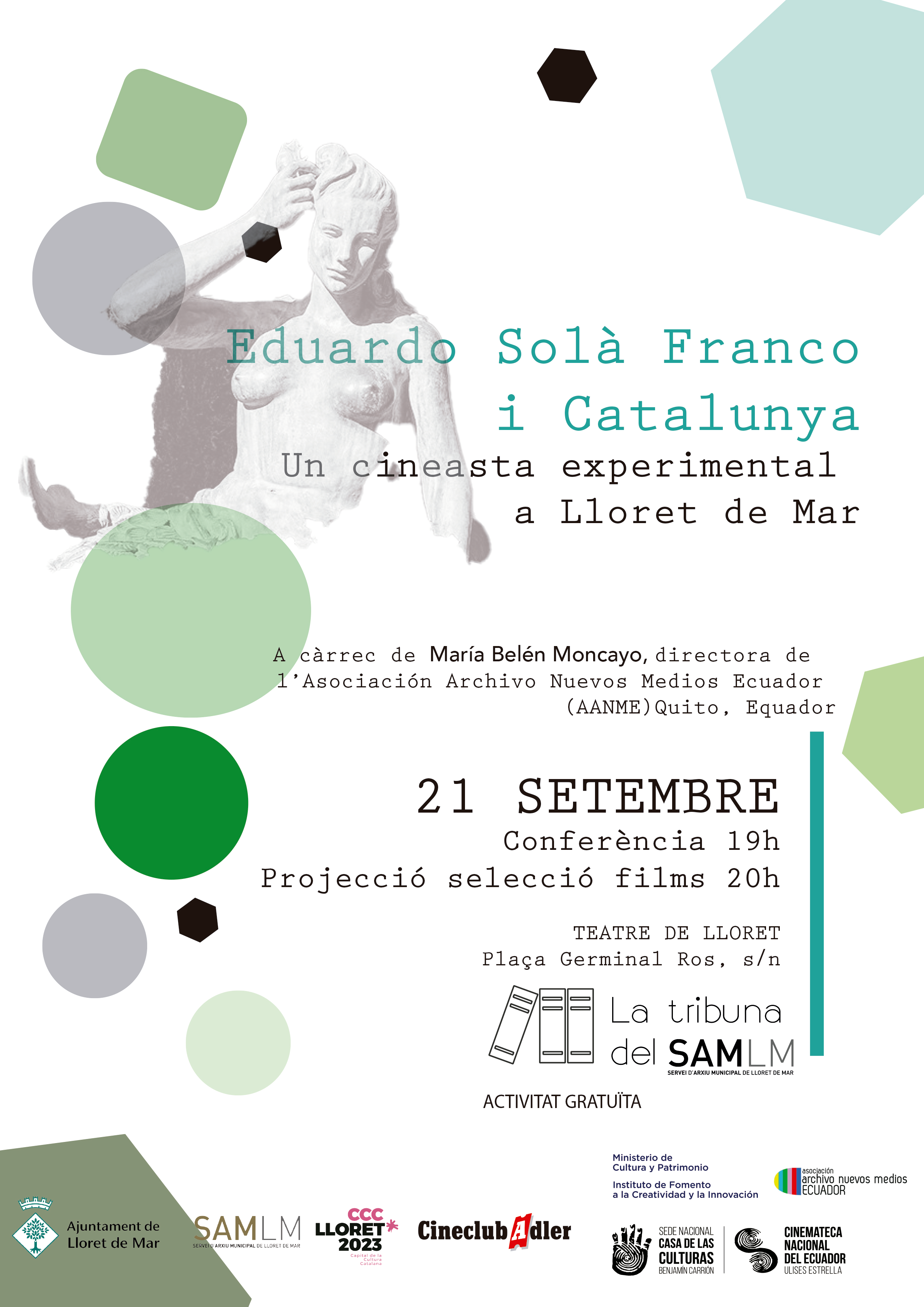 El Servei d’Arxiu Municipal de Lloret de Mar i el Cineclub Adler us presenten la cinquena edició de la TRIBUNA DEL SAMLM amb el títol Eduardo Solá Franco i Catalunya. Un cineasta experimental a Lloret de Mar a càrrec de María Belén Moncayo, directora de l’Asociación Archivo Nuevos Medios Ecuador (AANME) de Quito, Equador.