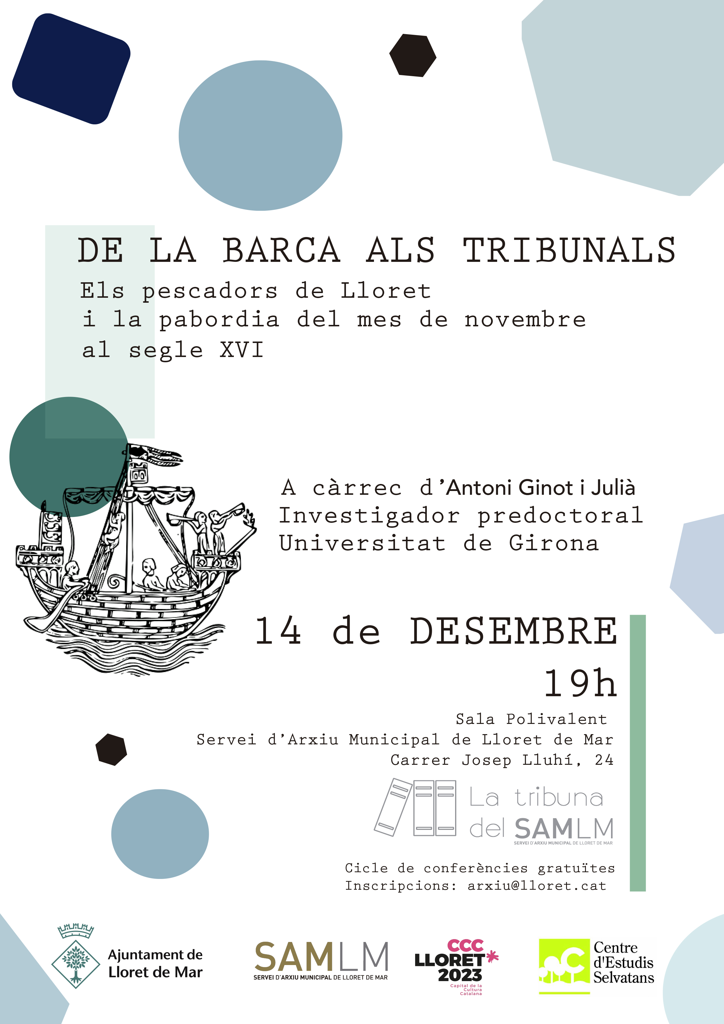 El Servei d’Arxiu Municipal de Lloret de Mar organitza dijous 14 de desembre a les 19h a la Sala Polivalent del Servei d'Arxiu Municipal de Lloret de Mar la sisena edició de la Tribuna del SAMLM amb el títol De la barca als tribunals: Els pescadors de Lloret i la Pabordia de Novembre al segle XVI a càrrec d’Antoni Ginot i Julià (Investigador predoctoral a la Universitat de Girona).