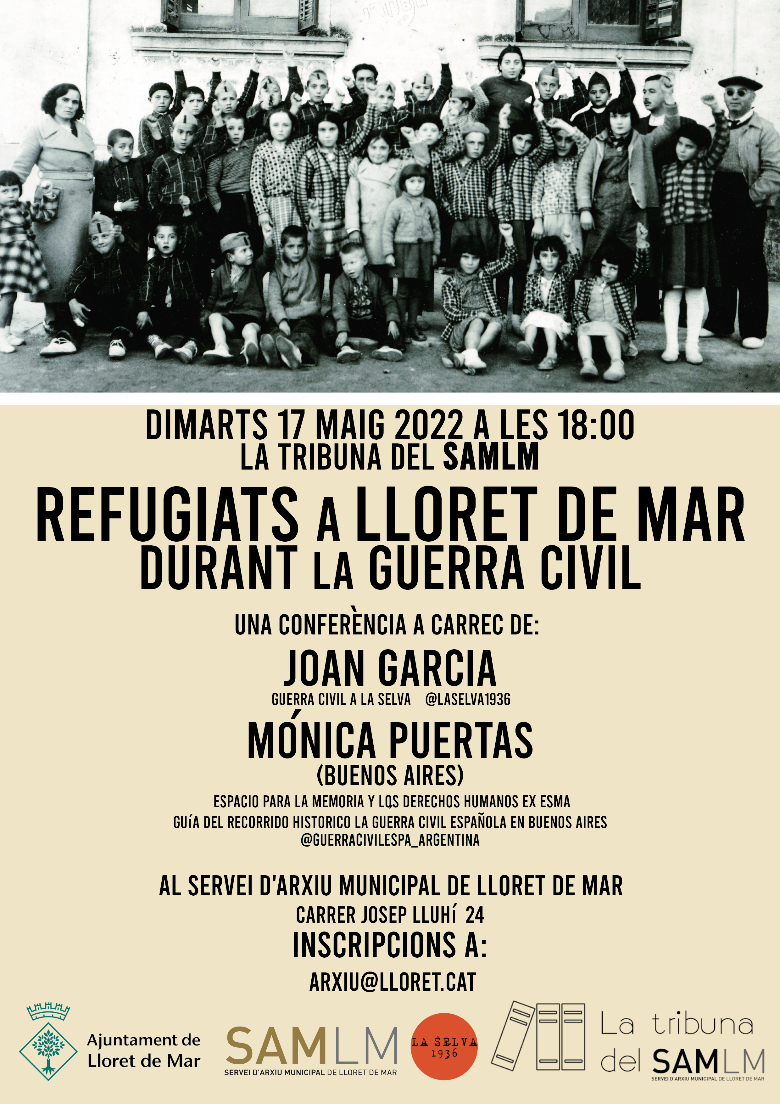 Iniciem el cicle amb la conferència Refugiats a Lloret de Mar durant la Guerra Civil a càrrec de Joan Garcia Lupiañez, investigador i responsable de la pàgina Guerra Civil a La Selva, i de Mònica Puertas, del Espacio para la Memoria y los Derechos Humanos de Argentina.