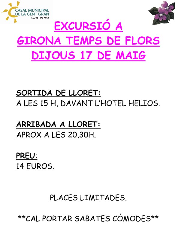 Sortida a les 15h des de l'Hotel Helios, arribada a Lloret aproximadament a les 20.30h.