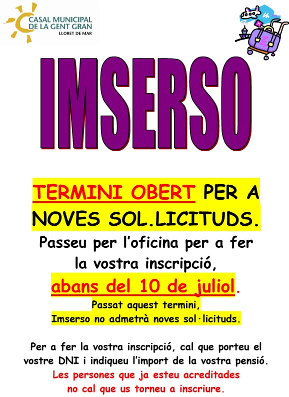 Termini obert fins al 10 de juliol, passat aquest termini Imserso no admetrà més sol·licituds.