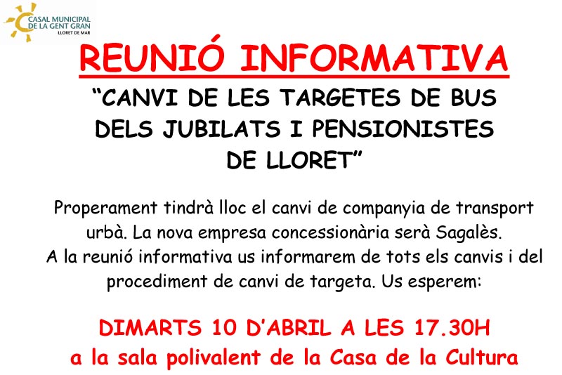 Reunió informativa sobre el canvi de concessionari del transport urbà de Lloret de Mar i el canvi de targetes de transport dels jubilats i pensionistes de Lloret.