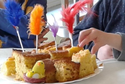 Una de les tradicions de la nostra terra és celebrar la Pasqua. Des de la cuina, la Claus ens fa un pa de pessic que mengem per berenar decorat amb plomes i pollets.
