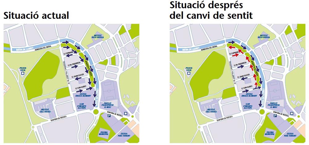Amb l’objectiu de continuar reordenant l’espai urbà, millorar la seguretat viària i pacificar el trànsit a l’entorn escolar, s’invertirà el sentit del carril de serveis paral·lel a l’avinguda del Rieral, fins ara amb el mateix sentit de circulació que aquest. D'aquesta manera es pretén que molts vehicles puguin evitar l'accés al giratori, i puguin accedir a la zona nord de manera més àgil i ràpida.