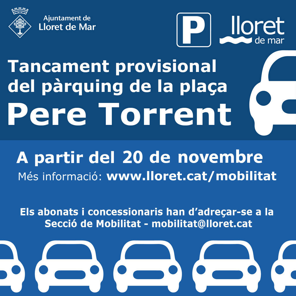En motiu de la remodelació integral de la plaça Pere Torrent, per motius de seguretat l'aparcament de Pere Torrent restarà tancat al públic a partir del proper dimecres 20 de novembre.