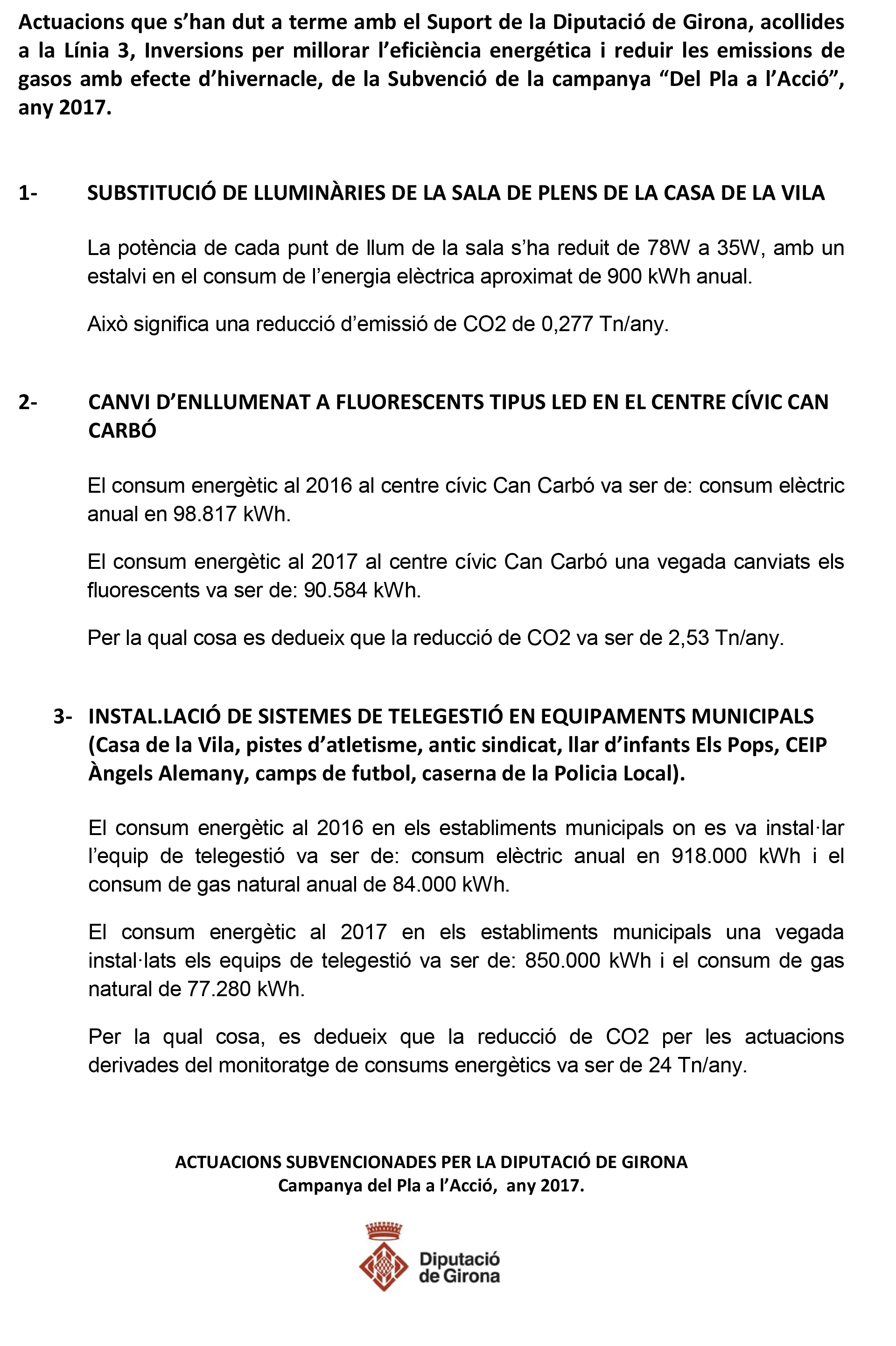 Actuacions que s’han dut a terme amb el Suport de la Diputació de Girona, acollides a la Línia 3, Inversions per millorar l’eficiència energética i reduir les emissions de gasos amb efecte d’hivernacle, de la Subvenció de la campanya “Del Pla a l’Acció”,