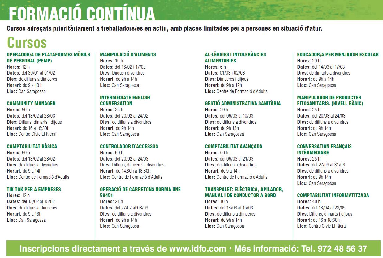 Cursos adreçats prioritàriament a treballadors/es en actiu, amb places limitades per a persones en situació d’atur.